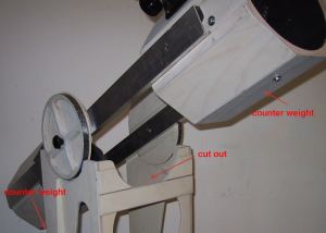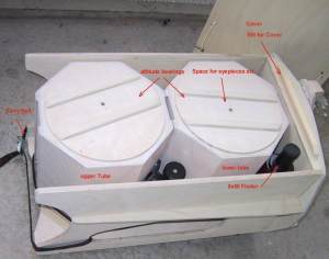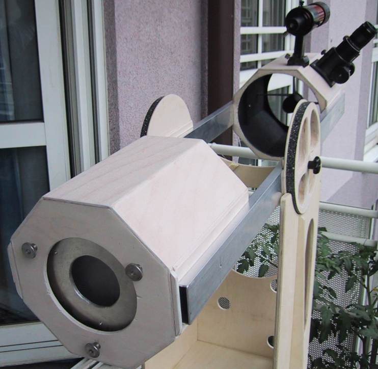 Mostly I stuck to the 2 parallel- bar design from Albert Highe (thank you Albert for the Idea), but glued together the tube pieces for the mirror box and upper cage to octagons from 3 mm plywood. The bars are from 50x15x2 mm (2x0.6x0.08") rectangle aluminum tube, that nest in wooden ledge guides, to give a firm seat with just one bolt each. The fit is very stable and keeps collimation quite well. With this design the altitude bearings can be mounted directly at the bars, which is an advantage particularly with smaller scopes, that have a relatively high balance point. The parts like diagonal, 8x50 finder and eyepieces I got from the Taiwanese Dobsonians via ICS. |