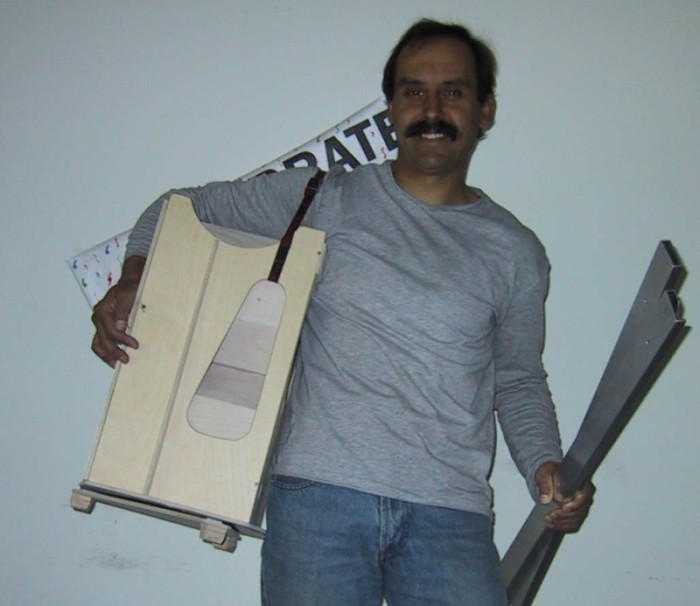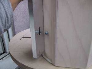 For this thin a mirror I made a 6 point flotation cell. After being coated, it was silicone glued at the ends of the 3 bars (see picture). Collimation is done by tilting the whole aluminum base with springs and hand knobs (see picture) against the mirror box bottom (see picture from the back side). |