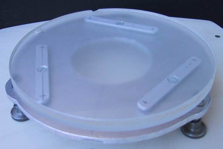 So, I got out the two 6.6" glass blanks, that were lying around and oh, I had again carbo 80 between my fingers. The glass is just 10,6 mm (0.42") thick, a bit too thin, but it worked better than I thought. |