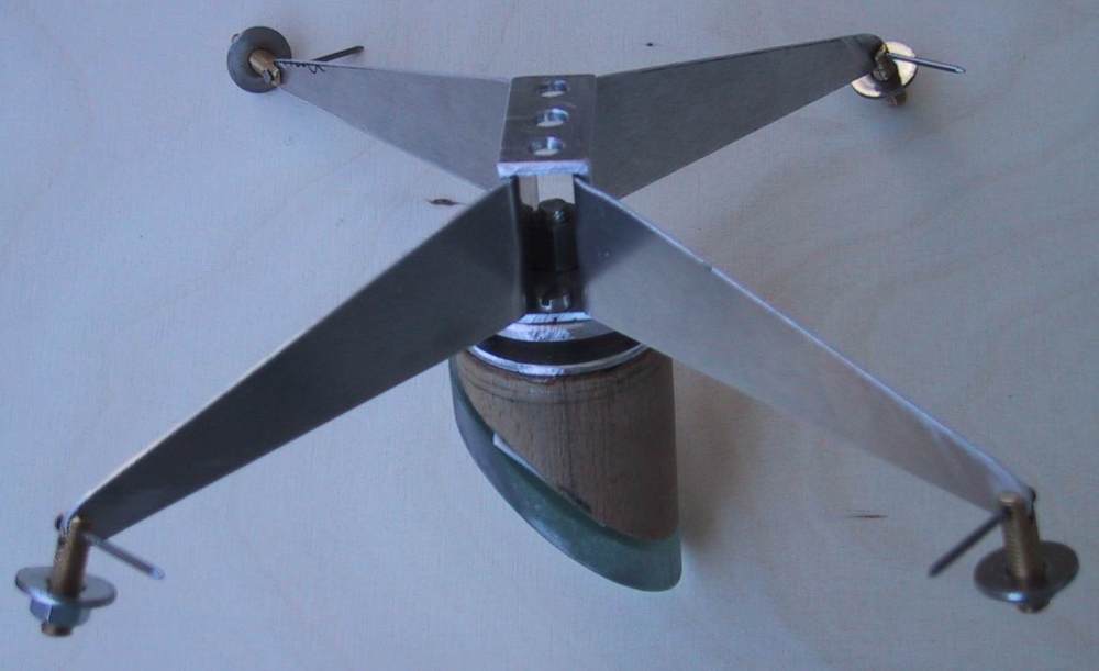 The spider consists of a 30x15x2 mm rectangle aluminum tube, where the angled fins (1 mm aluminum) are put through. (separate parts see picture). Due to the excentric design it is of enormous stiffness, it would have done for a 18" as well. Collimation is done via 4 bolts that press against an al-plate pulled by a central bolt. This setup is also much stiffer, than the central bolt design, that I see in most commercial spiders. |