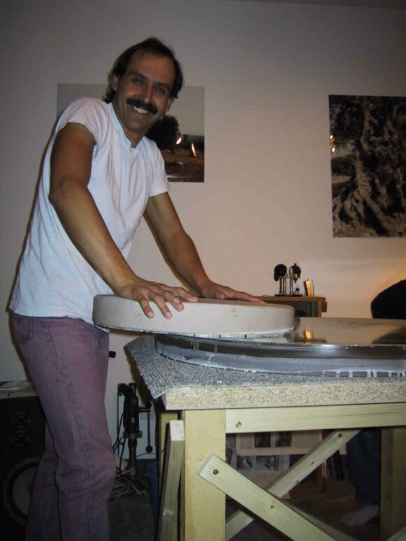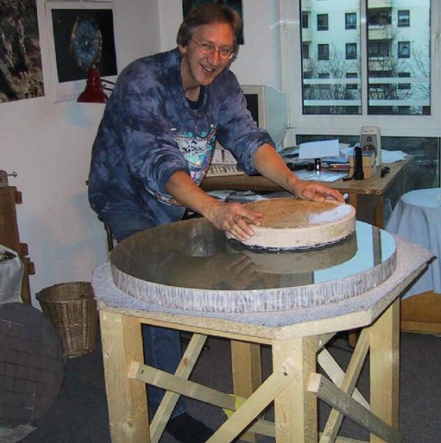 This was a joint project with Ralph Muth and Frank Richardsen, two experienced deep sky observers, who want to build something lightweight and compact, that collects one star magnitude more light than their current 20" scopes. "What, you want to BUY the mirror?"- this hit my glass pusher heart. "WE can make it!" Our configuration seems to be ideal: Frank wants Einstein's Cross brightly shining with all its 4 components, Ralph wants to try, if 32 inch will fit into his Opel Corsa and I can satisfy my mania for large thin mirror making. So the blank rolled end of December 2001 into my room and is dominating it by its pure size.
