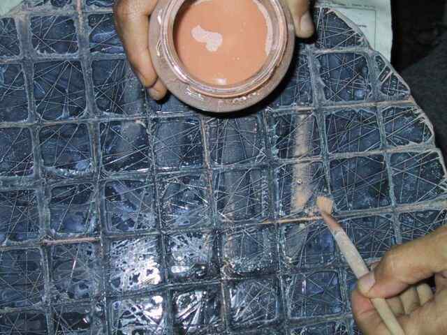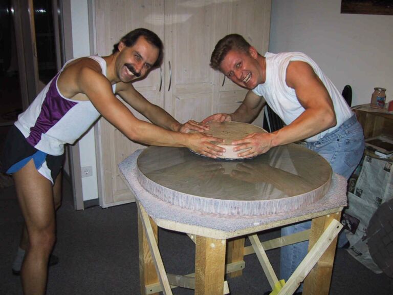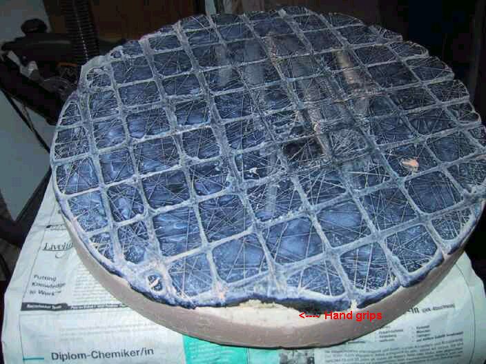 and tiles: Diameter: 480 mm (18") Thickness incl. tiles : 70 mm (2 3/4") Weight: 21 kg (46 lb) The unglazed tiles 50 x 50 mm (1" x 1") were glued with epoxy resin onto the tool. Note the cutouts in the plaster that serve as grips for a safer handling of the heavy tool. |