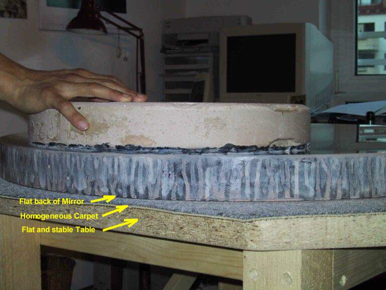In order to prevent astigmatism due to bending, large thin mirrors should be ground flat at the backside and should rest on a flat and stable underground. Between mirror and underground I use a piece of carpet, to compensate the remaining unevenness. |