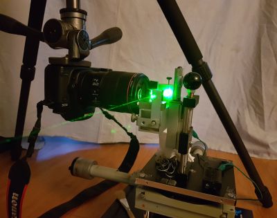 The nice and highly functional Bath interferometer in 45° arrangement build by Alois and Alfredo. It showed almost no astigmatism on the mirror. The overall astig due to the mirror sagging in the test stand is obvious, but stays the same, when the mirror is rotated. |