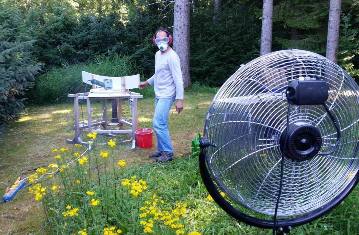Protective mask, ear protection and a strong fan, that blows the dust away from the body |