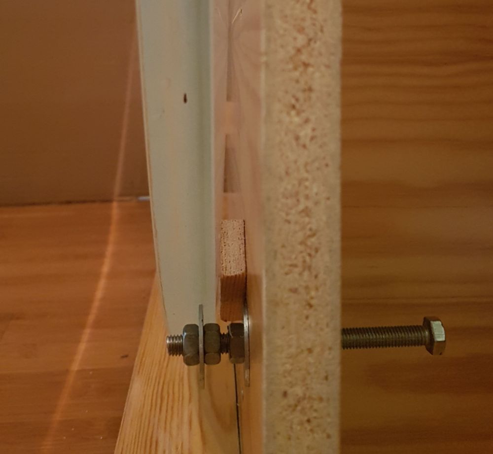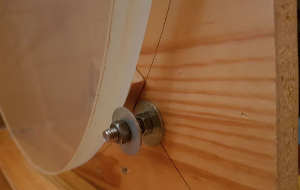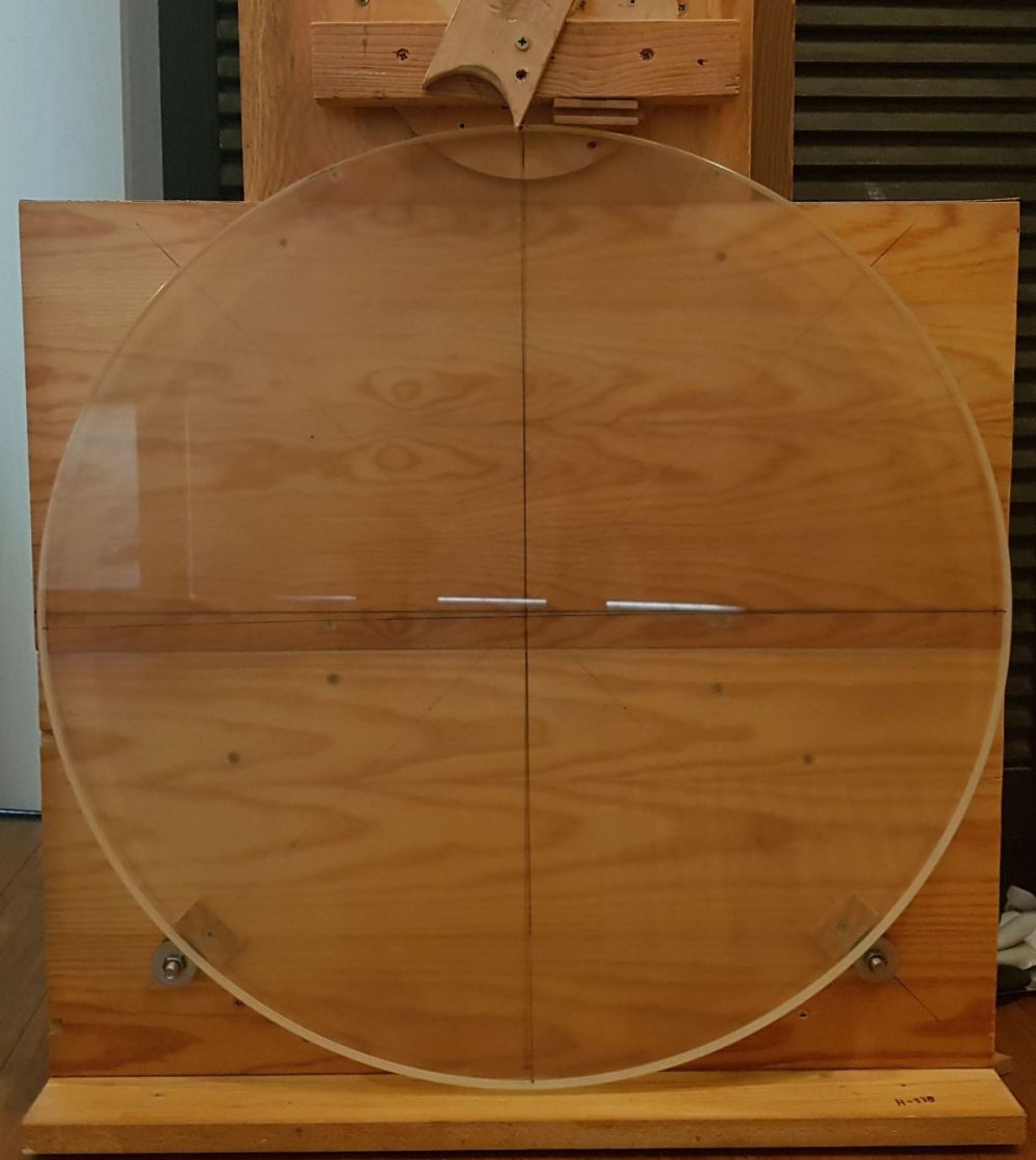 The mirror on the test stand with 2 lateral supports in 2x45° orientation. The edge supports are made of large washers, that are placed exactly under the center of gravity, which is in this case 5 mm from the back edge. This way the mirror hovers on the supports almost free of axial forces from the back or from the front side. |