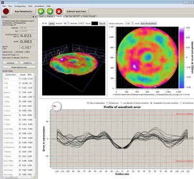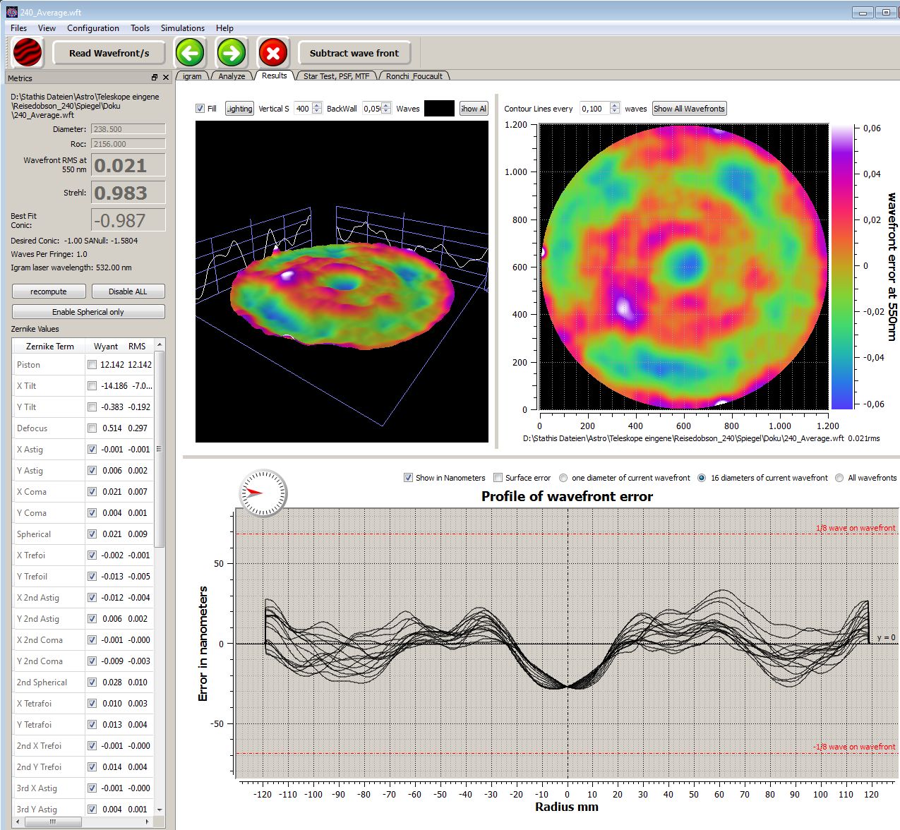 The mirror testing was carried out with the Bath interferometer of the club (made by Tassilo) and data reduction with DFT-Fringe. We averaged 4 interferograms for 0° and 4 for 90° rotation and averaged them out, to get rid of the test stand astigmatism. Here is the final result of my mirror. All the other mirrors got very fine as well, even those of the novices.