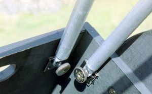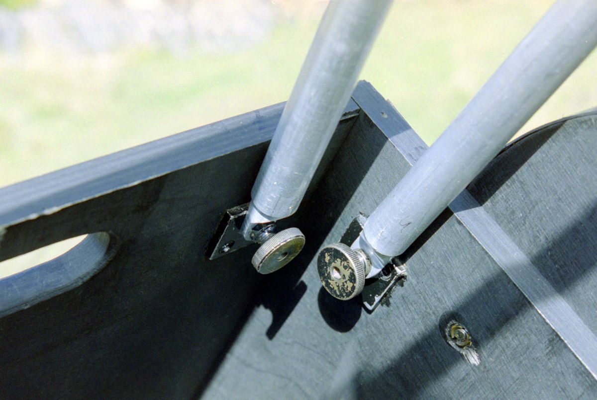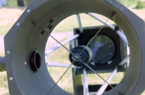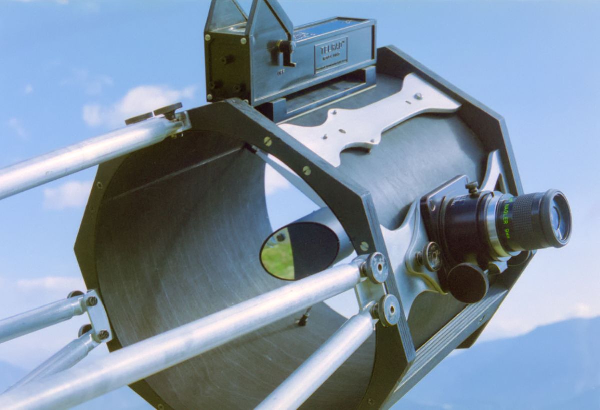 I tested the mirror with a rudimentary Foucault Tester of a piece courtain rod +bicycle bulb on mimileter paper (see original test chart from 1990 and later FugureXP analysis with the original data). An interferometer test in 2021 reveald a good match with the old method (see also comparison tests old against new in mein aller erster Spiegel in the forum Astrotreff). Many years later I remounted this mirror into the much more compact version "Travel Archimedes" and made for this initial one a new 10" f/6.25 planetary mirror. It became a really good one at approx. Lambda/10 wave (see Foucault test analysis.pdf). Though, it is amazing, how sensitive the star test is: I still can see defects in extrafocal images. Following the Clark design, the focuser is removable with 2 hand knobs in order to make the secondary cage fit into the mirror box which fits itself with the trunnions removed into the rocker. The collapsed box is 40 x 40 x 50 cm (16" x 16" x 20") and can be transported in an airplane, as I did on a trip to Tenerife. Since I used 15 mm (0.6") Birch plywood for the mirror box and rocker and a heavy 80 mm finder, the total weight went up 28 kg (62 pounds). Later I replaced the annoying star diagonal finder by a Telrad, as you see in this pictures at left. What a difference to the latter travel design at 10 kg (22 lb), but at star parties other people feel more comfortable, to hold some more material in their hands. The diagonal is 54 mm (2.14"), so at 21% linear obstruction not very small. I am not enthusiastic about exceedingly small secondaries, the mirror Quality is what really makes the difference. It's kept in place by a Novak secondary holder and spider. The trusses are fixed at the top and low end with Ø 17 mm (0.67") aluminum studs with a bore to accept the M6 (0.24") bolts. The studs are epoxied into the trusses. This method is very stable and keeps collimation, but requires to screw and unscrew the 16 clamp knobs. See the later developments at my other designs. Despite that, with some practice, set up still takes no more than 8 minutes. The altitude trunnions are covered with smooth polyurethane laminate which shows a bit more friction, but works fine in combination with the relatively small diameter bearings. In the following minimalist designs I used larger bearings. For the azimuth I changed later to pebbled "gold coated" aluminum sheet, which proved superior. For finding the objects and for wide field observations I mounted initially a Lumicon 80 mm Super Finder at the seconday cage. The finder had a lot light gathering power, but I was too much confused by the mirror reserved image due to the diagonal mirror. In that time affortable Amici prisms were not available. So, I changed to a Telrad Finder as seen in this images. If you consider, to build your own first Dobsonian, there is not much to make wrong, if you follow a similar design. Be aware, that a