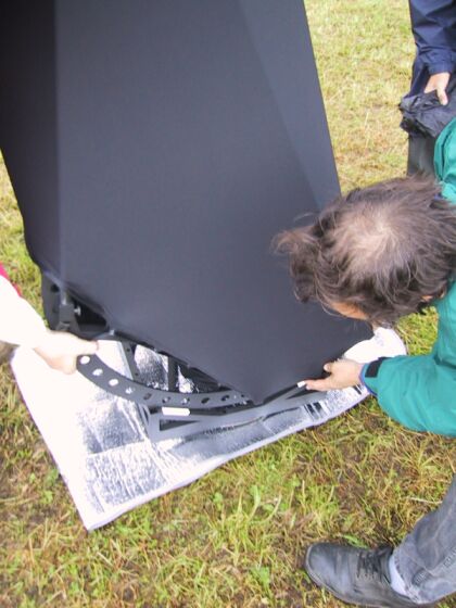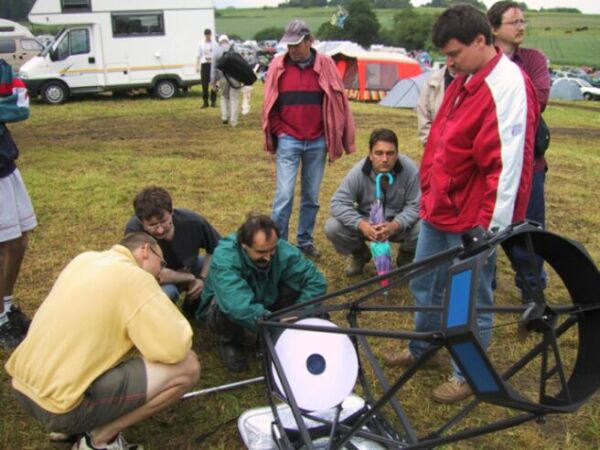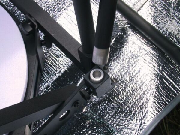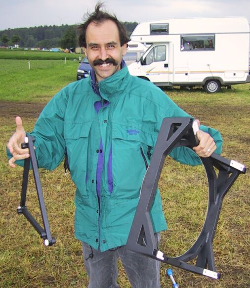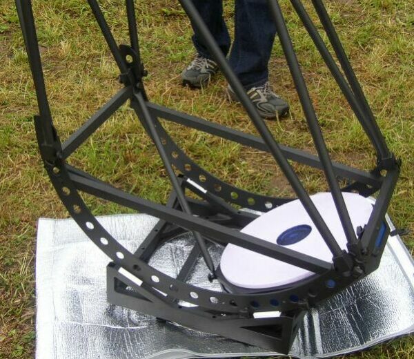Joerg built a travel scope that had to fulfill the air travel carry on luggage limitations, jet be as big as possible. So, the dimensions and weight had to be kept within tight limits - of course without compromising optical and mechanical performance. When I heard of this project, I burned to make the ultrathin mirror for it. The scope was finished just in time for the Telescope Meeting at Vogelsberg / Germany (ITV) in May 2003. The prototype version tipped the scale at just 10.8 kg (24lb), but showed due to the too thin trusses, the too weak rocker and the insufficient alt bearing connecting bars too much vibrations.