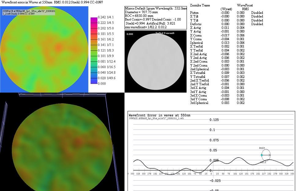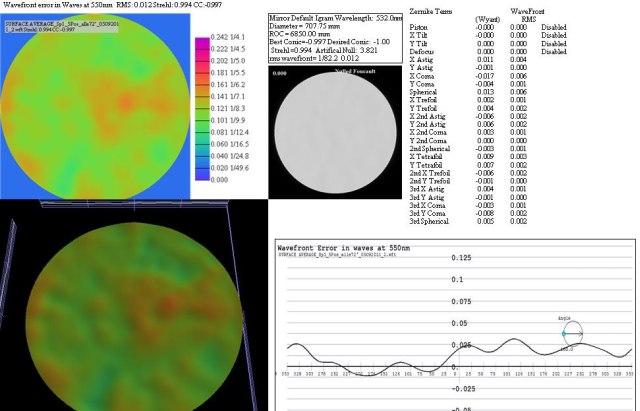 My mirrors have a thickness of 38mm, therefore all has to match perfectly for a sure measurement. In upright position the mirror generates fold-astigmatism and trefoil at the support points due to it's own weight. The thinner the mirror the larger is this effect. This is no error of the mirror itself.