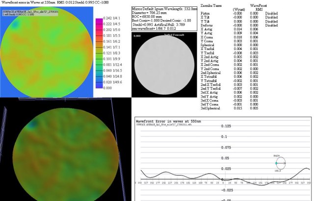 After local polishing the topography of mirror was evaluated by using a Bath interferometer. At the final stages the ratio between polishing and evaluating was 5 minutes polishing versus one whole day measuring, evaluating and planning the next polishing session. The analysis was executed with the brilliant program "Open fringe" from Dale Easen. Dale, thank you very much for providing. Without this program it would be impossible to make optics of that quality.