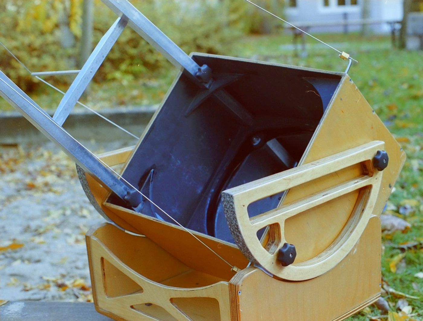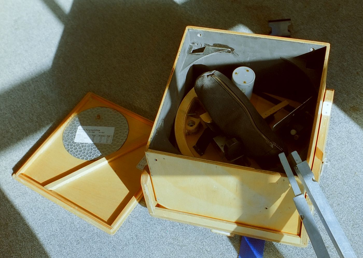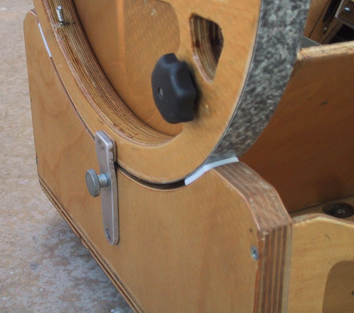 I had made in the beginning of the nineties a 10" f/5.4 mirror and mounted it in a 30 kg (66 lb) heavy Dobsonian with the name Archimedes, which I and my Berlin astro- friends had a lot of fun with. The imagination, to capture with this nice mirror the Eta- Carina nebula and the Magellanic Clouds onto the retina caused sleepless nights. How I get 10 inches onto the airplane? Will 8 trusses fit into the suitcase? Why I need a secondary cage at all? Can't I nail the eyepiece with 2 bars directly onto the glass? The 2 bar idea I had realized with my 6" Travel Dobson at 6 kg (13 lb) before, but here the mirror itself weighted 5 kg (11 lb) already, so I had to "hunger out" every single gram from the mechanical structure. Of course, any compromise regarding optical and mechanical performance was strictly forbidden.. After some weeks of intensive work the new "Travel Archimedes" was born: 10 inches at 10 kg (22lb) and compact enough to fit into nearly every airplane hand luggage compartment (34 x 31 x 30 cm). You pass with your wooden "beauty case" sovereign through the security check and are sure, that you didn't forget anything. In the mirror box there are besides the primary mirror, which lies secure in its cell separated by the mirror cover all parts needed: Altitude bearings, secondary-focuser assembly, reflex finder, all bolts and tightening strings, eyepieces, red LED light torch, observing book and warm socks. The 2 bars can be folded and fit into every suitcase or backpack. Set up takes 8 minutes including collimation, without any tools of course. For all wood parts I use Baltic Birch plywood. Beech plywood is a bit heavier and very strong as well, but is more difficult to find, at least in Germany. Look after as many layers as possible for a given thickness. In Germany you can find a so called "Gabun plywood", which is more lightweight, but not as stable as Birch. Use this stuff where weight is a bigger issue than stability. For all removable screw connections I use threaded inserts (T-nuts), that are knocked into the wood and additionally secured with epoxy glue. The details: The mirror box is screwed and glued out of 6.5 mm (0.26") plywood. The bottom panel and the reinforcements in the corners provide the needed stability. Only the side panel, where the bars are attached to, is made out of 9 mm (0.35") material. Everything is so strong, it survives even harsh treatment. The mirror support is a modified 9-point flotation cell. The mirror rests on the corners of 3 small triangles whose centers pivot on the 3 collimation bolts. Two rectangular hollow bars of 15 x 15 x 2 mm (0.6" x 0.6" x 0.08") transfer the weight of the mirror to the box. Wooden stoppers provide the radial support and leave a small gap, to allow for free floating mirror. Due to this low profile cell and the cut off corner at the front side the mirror floats barely 20 mm (0.8") above the bottom of the mirror box! At the eyepiece end it is essential, to save weight as much as you can. Here at the long lever arm every single gram counts, to bring the mass of equilibrium down! So the usual secondary cage diminished to an "focuser - secondary holder head" which is fixed via 2 clamp knobs at the bars. A simple but ultra-light 1¼" helical focuser from Lumicon is sufficient to bring to focus all my favorite eyepieces. The secondary with its adjustable holder hangs on two V- oriented steel sheets. However, I never need to re-collimate the secondary. Directly behind the the diagonal holder (so in the light path!) there is one of the most important components: The secondary baffle, made out of pebbled sheet aluminum. It prevents stray light from reaching the eyepiece very effectively and can be kept much smaller compared to baffles, that are placed opposite the focuser outside the light path. On top of this I use ring baffles made of empty filter sleeves with threads to both sides and plastic film cans. They are threaded directly onto the eyepieces and accept form the other side additional UHC or OIII filters. Every eyepiece has it's own baffle sized for it's specific field of view. Imagine, that you need to prevent the stay light only from falling into the eyepiece. As long as you achieve this, you won the game. Instead, other light straying around does not need to really bother you too much. The "tube" is reduced into two divisible aluminum rectangular hollow bars. The upper profile of 15 x 15 x 2 mm (0.6" x 0.6" x 0.08") is inserted into the lower one of 20 x 20 x 2 mm (0.8" x 0.8" x 0.08") and tightened with a single bolt via defined push and pull contact points. That is rock solid with no play. The lower bars are inserted into sockets at the bottom of the mirror box and are tightened with a single clamp knob each as well. The bars are in observing position in total 1,31 m long, inserted for transport 0,71 m. Due to the triangular orientation of the truss bars the structure is stiff along the plane of this triangle. Perpendicular to this plane it is statically unstable and is thus tightened with steel bowden cables like being used for bicycle shift mechanisms. At the mirror box the strings are inserted via separators to keep them outside the light path. All 3 strings have different lengths to better cancel out vibrations. At the telescope meetings it was called "Guitar Dobson". The sound is not really fine, but flex and vibrations were diminished by factor 4 at least! The altitude bearings are made as big as possible, but still small enough, to fit into the mirror box for transport. The teflon slides on textured kitchen counter top laminate similar to Formica. With my 180-280 g heavy 1.25" eyepices, that I use for this scope it is perfectly balanced. A brake is activated during the eyepiece change. The rockerbox is made as sandwich conbstruction to safe weight (see sandwich side und sandwich bottom). The azimuth bearing is covered with pebbled "gold coated" aluminum sheet, like used to cover window benches. The movements w