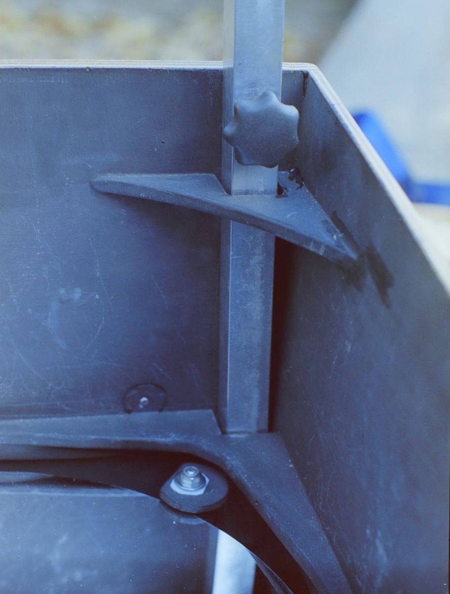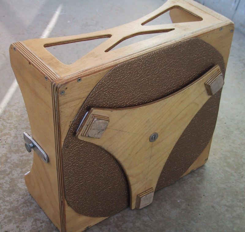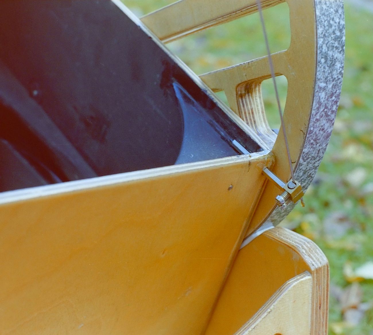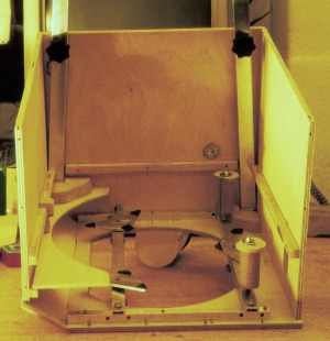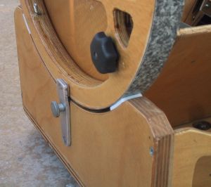 I had made in the beginning of the nineties a 10" f/5.4 mirror and mounted it in a 30 kg (66 lb) heavy Dobsonian with the name Archimedes, which I and my Berlin astro- friends had a lot of fun with. The imagination, to capture with this nice mirror the Eta- Carina nebula and the Magellanic Clouds onto the retina caused sleepless nights. How I get 10 inches onto the airplane? Will 8 trusses fit into the suitcase? Why I need a secondary cage at all? Can't I nail the eyepiece with 2 bars directly onto the glass? The 2 bar idea I had realized with my 6" Travel Dobson at 6 kg (13 lb) before, but here the mirror itself weighted 5 kg (11 lb) already, so I had to "hunger out" every single gram from the mechanical structure. Of course, any compromise regarding optical and mechanical performance was strictly forbidden.. After some weeks of intensive work the new "Travel Archimedes" was born: 10 inches at 10 kg (22lb) and compact enough to fit into nearly every airplane hand luggage compartment (34 x 31 x 30 cm). You pass with your wooden "beauty case" sovereign through the security check and are sure, that you didn't forget anything. In the mirror box there are besides the primary mirror, which lies secure in its cell separated by the mirror cover all parts needed: Altitude bearings, secondary-focuser assembly, reflex finder, all bolts and tightening strings, eyepieces, red LED light torch, observing book and warm socks. The 2 bars can be folded and fit into every suitcase or backpack. Set up takes 8 minutes including collimation, without any tools of course. For all wood parts I use Baltic Birch plywood. Beech plywood is a bit heavier and very strong as well, but is more difficult to find, at least in Germany. Look after as many layers as possible for a given thickness. In Germany you can find a so called "Gabun plywood", which is more lightweight, but not as stable as Birch. Use this stuff where weight is a bigger issue than stability. For all removable screw connections I use threaded inserts (T-nuts), that are knocked into the wood and additionally secured with epoxy glue. The details: The mirror box is screwed and glued out of 6.5 mm (0.26") plywood. The bottom panel and the reinforcements in the corners provide the needed stability. Only the side panel, where the bars are attached to, is made out of 9 mm (0.35") material. Everything is so strong, it survives even harsh treatment. The mirror support is a modified 9-point flotation cell. The mirror rests on the corners of 3 small triangles whose centers pivot on the 3 collimation bolts. Two rectangular hollow bars of 15 x 15 x 2 mm (0.6" x 0.6" x 0.08") transfer the weight of the mirror to the box. Wooden stoppers provide the radial support and leave a small gap, to allow for free floating mirror. Due to this low profile cell and the cut off corner at the front side the mirror floats barely 20 mm (0.8") above the bottom of the mirror box! At the eyepiece end it is essential, to save weight as much as you can. Here at the long lever arm every single gram counts, to bring the mass of equilibrium down! So the usual secondary cage diminished to an "focuser - secondary holder head" which is fixed via 2 clamp knobs at the bars. A simple but ultra-light 1¼" helical focuser from Lumicon is sufficient to bring to focus all my favorite eyepieces. The secondary with its adjustable holder hangs on two V- oriented steel sheets. However, I never need to re-collimate the secondary. Directly behind the the diagonal holder (so in the light path!) there is one of the most important components: The secondary baffle, made out of pebbled sheet aluminum. It prevents stray light from reaching the eyepiece very effectively and can be kept much smaller compared to baffles, that are placed opposite the focuser outside the light path. On top of this I use ring baffles made of empty filter sleeves with threads to both sides and plastic film cans. They are threaded directly onto the eyepieces and accept form the other side additional UHC or OIII filters. Every eyepiece has it's own baffle sized for it's specific field of view. Imagine, that you need to prevent the stay light only from falling into the eyepiece. As long as you achieve this, you won the game. Instead, other light straying around does not need to really bother you too much. The "tube" is reduced into two divisible aluminum rectangular hollow bars. The upper profile of 15 x 15 x 2 mm (0.6" x 0.6" x 0.08") is inserted into the lower one of 20 x 20 x 2 mm (0.8" x 0.8" x 0.08") and tightened with a single bolt via defined push and pull contact points. That is rock solid with no play. The lower bars are inserted into sockets at the bottom of the mirror box and are tightened with a single clamp knob each as well. The bars are in observing position in total 1,31 m long, inserted for transport 0,71 m. Due to the triangular orientation of the truss bars the structure is stiff along the plane of this triangle. Perpendicular to this plane it is statically unstable and is thus tightened with steel bowden cables like being used for bicycle shift mechanisms. At the mirror box the strings are inserted via separators to keep them outside the light path. All 3 strings have different lengths to better cancel out vibrations. At the telescope meetings it was called "Guitar Dobson". The sound is not really fine, but flex and vibrations were diminished by factor 4 at least! The altitude bearings are made as big as possible, but still small enough, to fit into the mirror box for transport. The teflon slides on textured kitchen counter top laminate similar to Formica. With my 180-280 g heavy 1.25" eyepices, that I use for this scope it is perfectly balanced. A brake is activated during the eyepiece change. The rockerbox is made as sandwich conbstruction to safe weight (see sandwich side und sandwich bottom). The azimuth bearing is covered with pebbled "gold coated" aluminum sheet, like used to cover window benches. The movements w