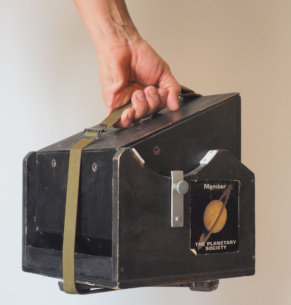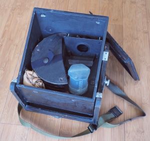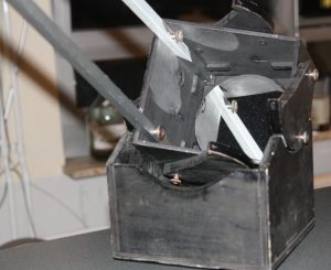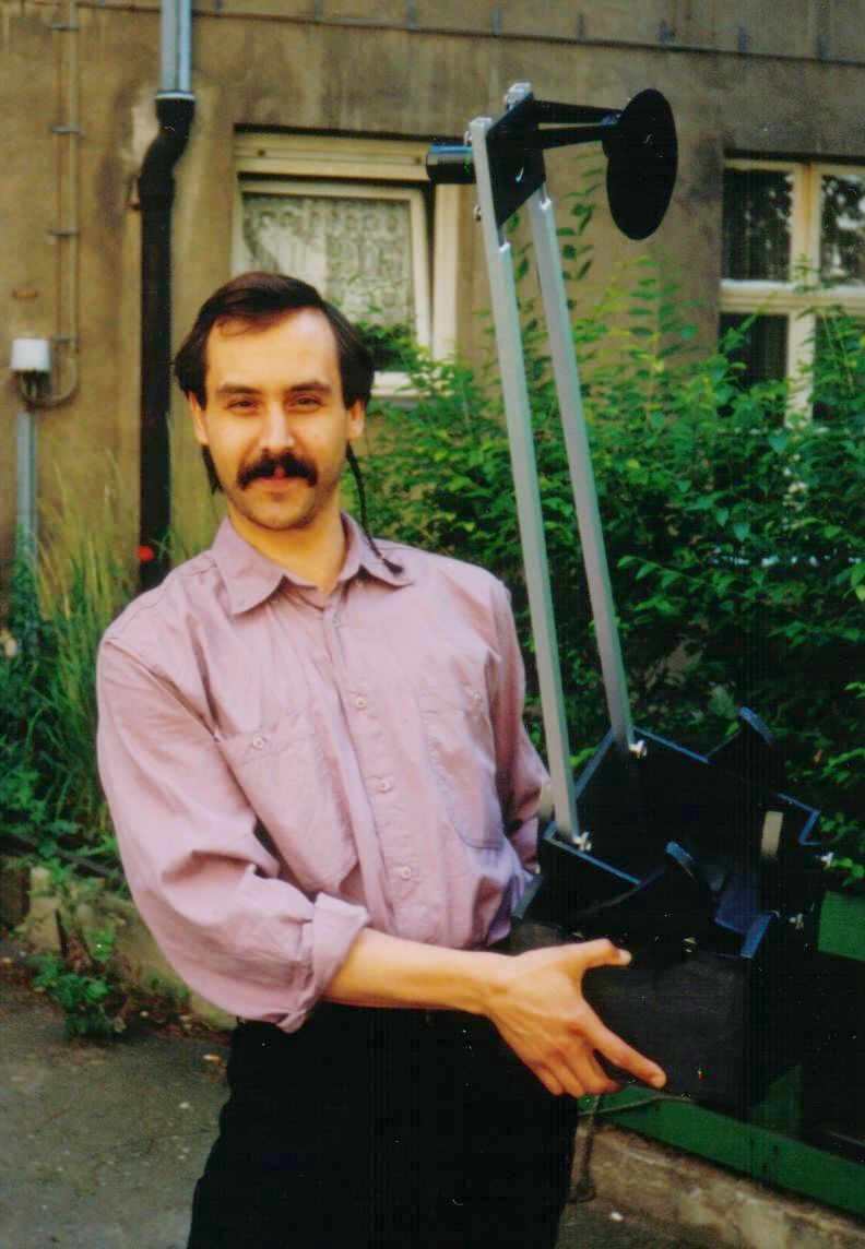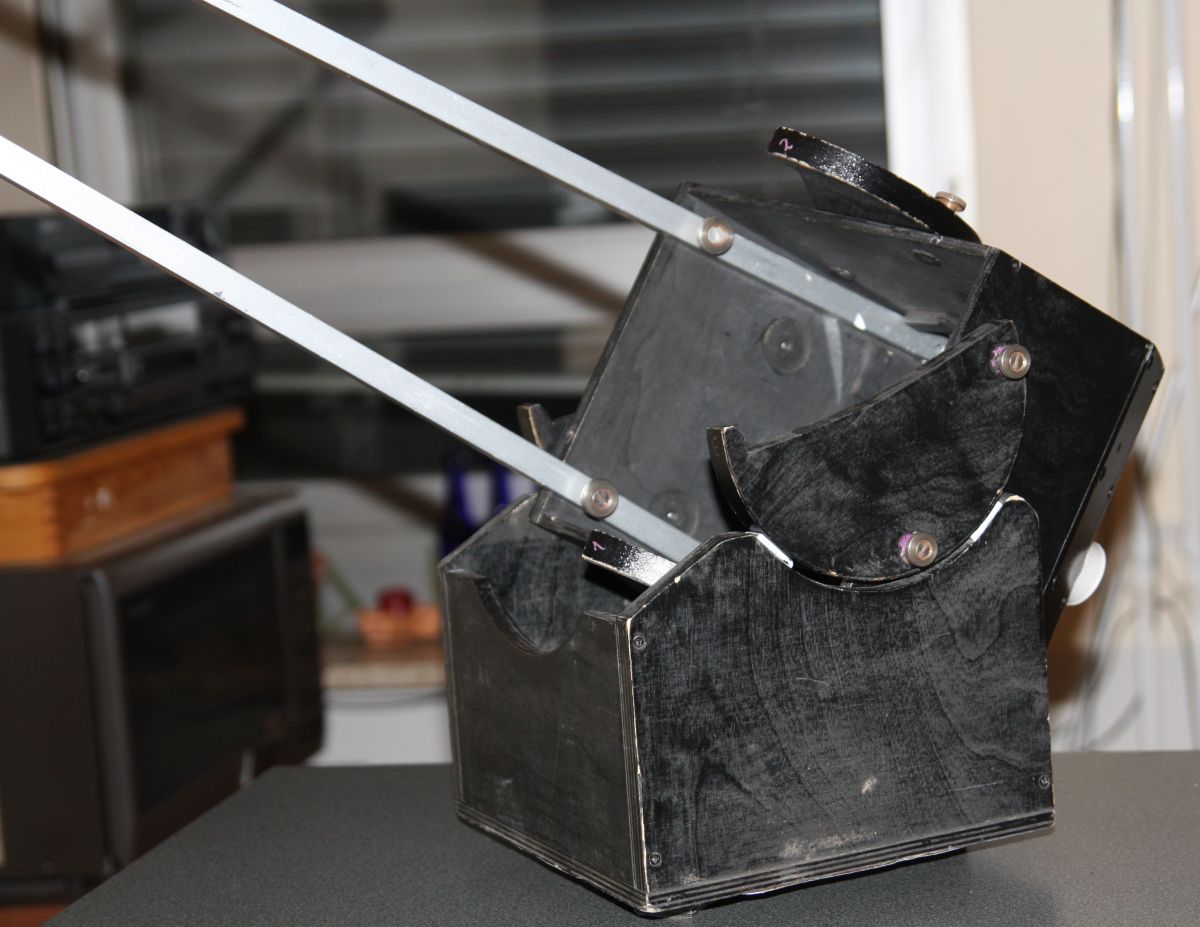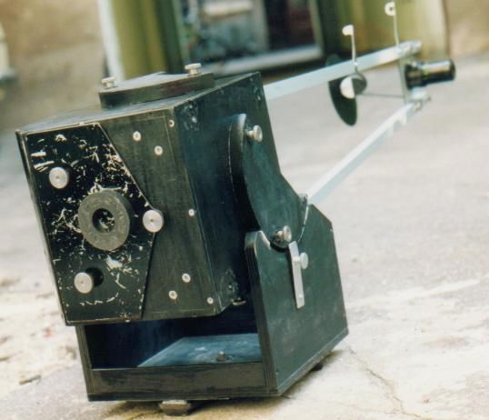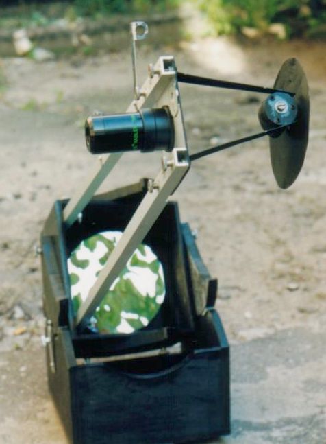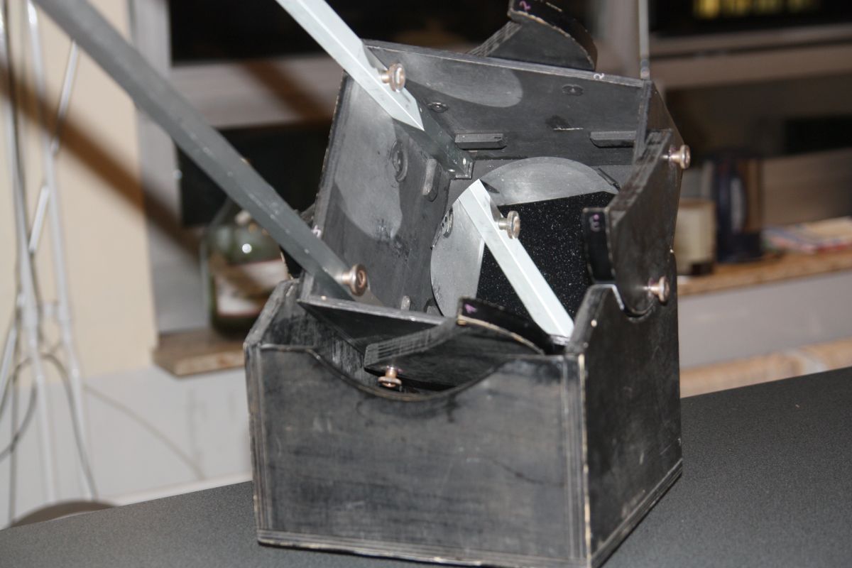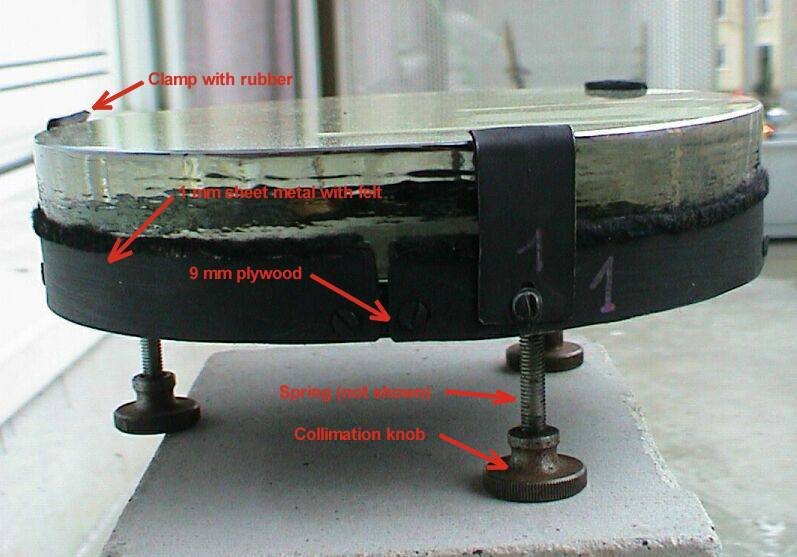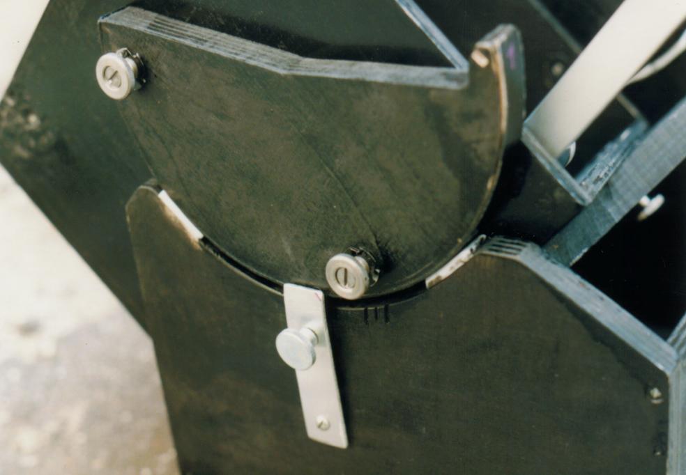 It's the same 2 bar design like at the bigger brother Travel Archimedes, only that here no reinforcing strings are needed. The mirror is one of the most accurate, that I ever made (see original test from 1991 and with Interferometer from 2021). See also comparison tests old against new in mein aller erster Spiegel in the forum Astrotreff. At the star test I can't see any defects, so I would give it a 2 for "lucky b@$#@rd!" as of Bratislav's mirror rating scale. On planets it shows as much detail as an expensive 4 inch apochromat. No focuser is mounted at all. My favorite eyepieces are quite homofocal and so focusing can be done by sliding the eyepiece in the 1¼" sleeve. To balance the scope with eyepieces of different weight I use magnets, that can be placed at the front end next to the eyepiece or at the sheet steel at the backside of the mirror box. I added this steel sheet counterweight to bring the balance point down, since compactness was a bigger design requirement than weight. A brake is activated while changing the eyepiece. 4 altitude bearings are mounted at the mirror box. When looking close to the horizon, the instrument can be tilted for a more comfortable view. For transport, all parts like bearings, secondary - eyepiece assy., eyepieces and bolts fit into the mirror box, separated from the mirror by the mirror cover. All components are very stable and motorbike approved. |