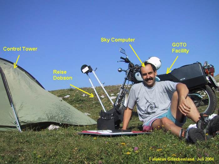 Travel Dobson weights 6 kilograms (13 pounds) and fits into the backpack or onto the motorbike. For me, traveling without a telescope is like without a tooth brush, only that the latter one you can buy everywhere you are. It travels on my trips to Greece always with me (even on the motorbike), but it was also in Kenya, Bolivia, Chile or on tracking tours to the Alps and on to Olympus. 6" Aperture can mean a lot, if the sky is really dark and transparent. My best conditions in my life I had on the Altiplano in Bolivia and Chile at 3,800 m elevation (12,500 feet) where the milky way cast shadows and the Eta Carina Nebulae was full of overwhelming detail. |