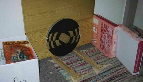 For polishing I used a 5 kg (11 lb) 12" plaster tool with 28° pitch from Piering and the fine Ceroxyd suspension CERI 3000 from Pieplow & Brandt. I polished TOT on a piece of carpet on a flat underground (see picture) on which the mirror was frequently rotated. The use of a turning table, which I sometimes see, does not help here, it's essential to rotate the mirror itself! Otherwise all unevenness on the underground will press always against the same spot of the mirror an will print trough. After 8 hours rapid polishing the mirror was polished out, but showed a central hill, which I could not explain. Was it due to flexing under the heavy tool? I put a 0.3 mm (1/80") thick carton UNDER the central part of the carpet as a support and after half an hour the mirror was exactly spherical. This reminds me of the fairy-tale with the princess and the pea under her mattress. This is no joke, so sensitive can glass react.