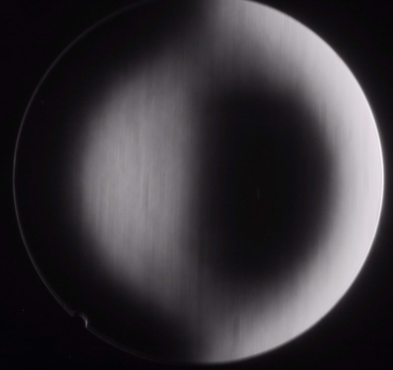 The essential step to an ultralight Dobson that cools down quickly is a thin mirror. But how thin can it be? I tried it with a 360 mm (14") Schott borosilicate blank of 20.6 mm (0.81") edge thickness (at f/4.5 the center is 15.6 mm (0.61") thick). The blank showed no internal stress in the cross polarizer test with a LCD display of a notebook. It is not really advisable, to work with so thin a "Pizza", the additional problems with flexing are not trivial. But I wanted to see how far I can push the limits. If you have no experience in mirror making, I recommend, not to go so thin.