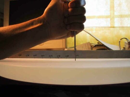 . It splashed around a bit, but no dust in the air! I swung the machine free hand back and forth without using a fixture or a router. I just rotated the blank from time to time and measured the depth at different points. A 1 cm wide edge was left unground, to prevent edge chipping. If you don't like the freehand method, see the wood jig + blank rotator a lá Robert Nowak, or the radius generating machine of Wolfgang.