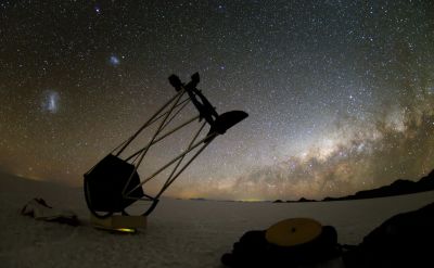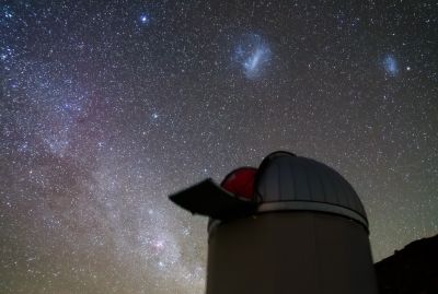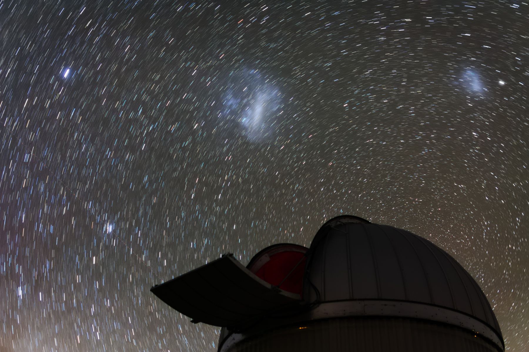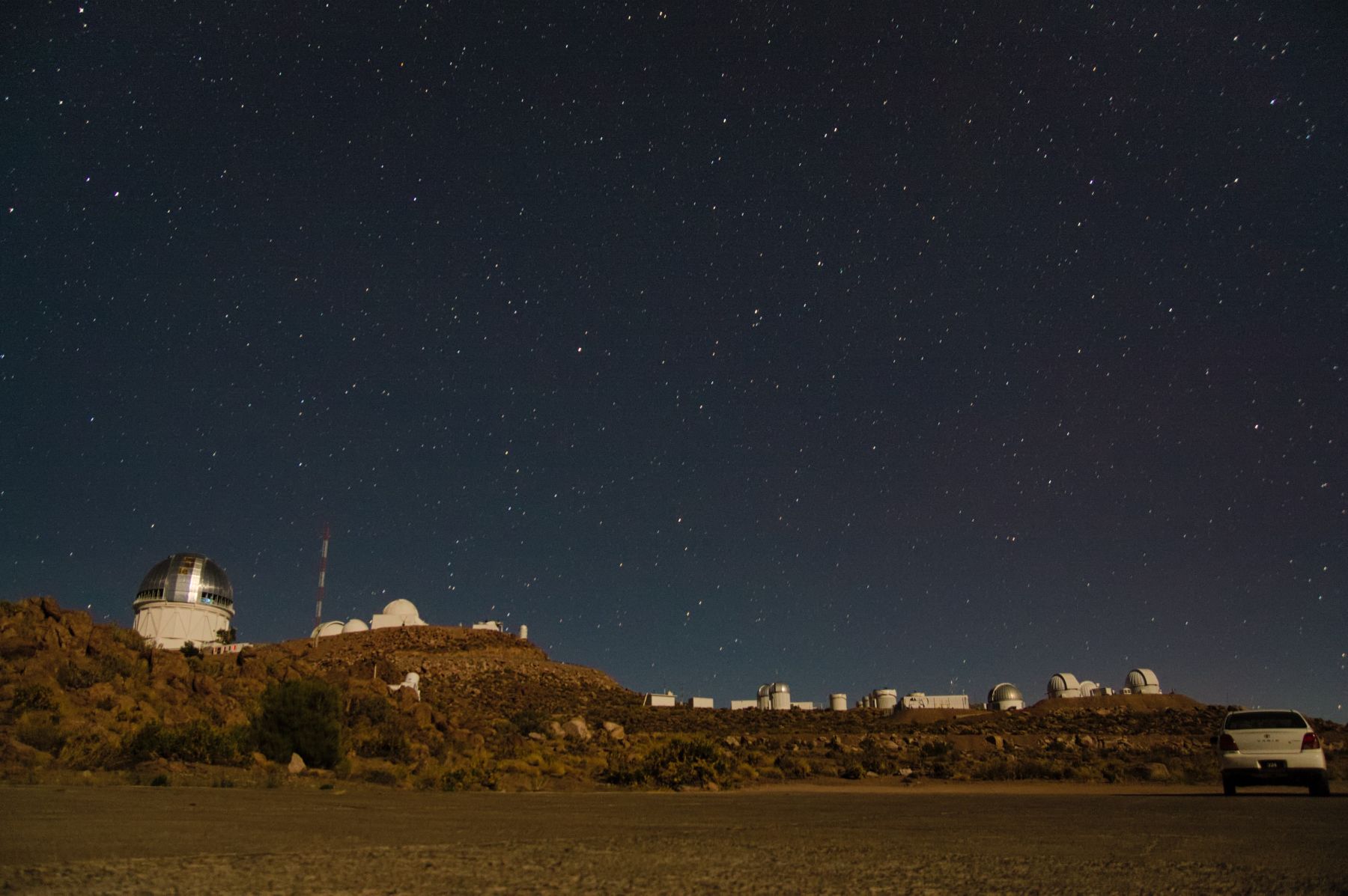 Observatorium mit südlicher Millchstraße, Eta Carina, Magellansche Wolken CTIO, Chile, Nov. 2014. Bortle 1 Version ohne Nachführung mit 24 mm f/1,4 bei f/2. 4,5 min bei 800 ASA Telekopkuppeln bei Mondlicht |