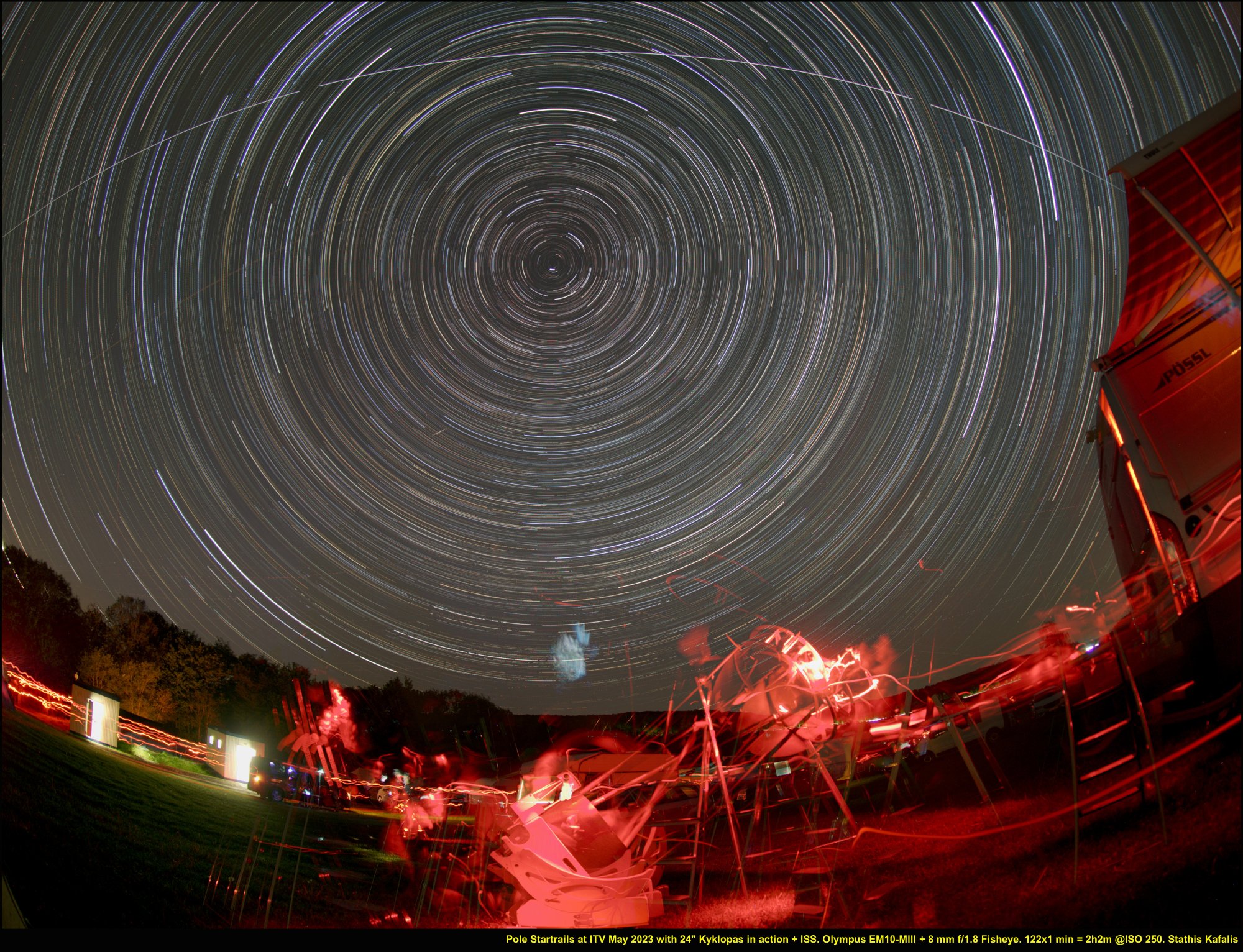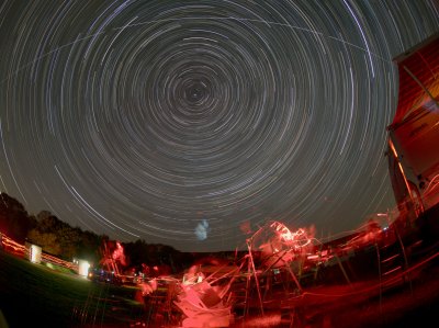 Himmelsnordpol Strichspuren am ITV 2023 hinter 24" Dobson in Action Gederner See, Mai 2023, Bortle 4 Stack mit Sequator. Entwicklung mit Raw Therapee Zeitraffer Video (4MB .mgp4), erzeugt mit "Startrails". Video Strichspuren (2MB .mgp4), erzeugt mit "Startrails". Im Astrotreff weitere Bilder von M81/M82, Markarian's Chain und Nordamerikanebel NGC 7000 |