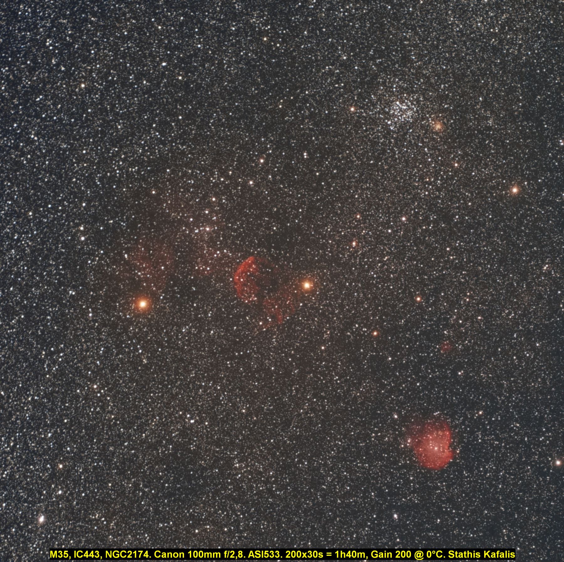 Am Fuß des Castor bei m Gem: M35 mit Hintergrundhaufen NGC 2157, Quallennebel IC 443, Affenkopfnebel NGC 2174