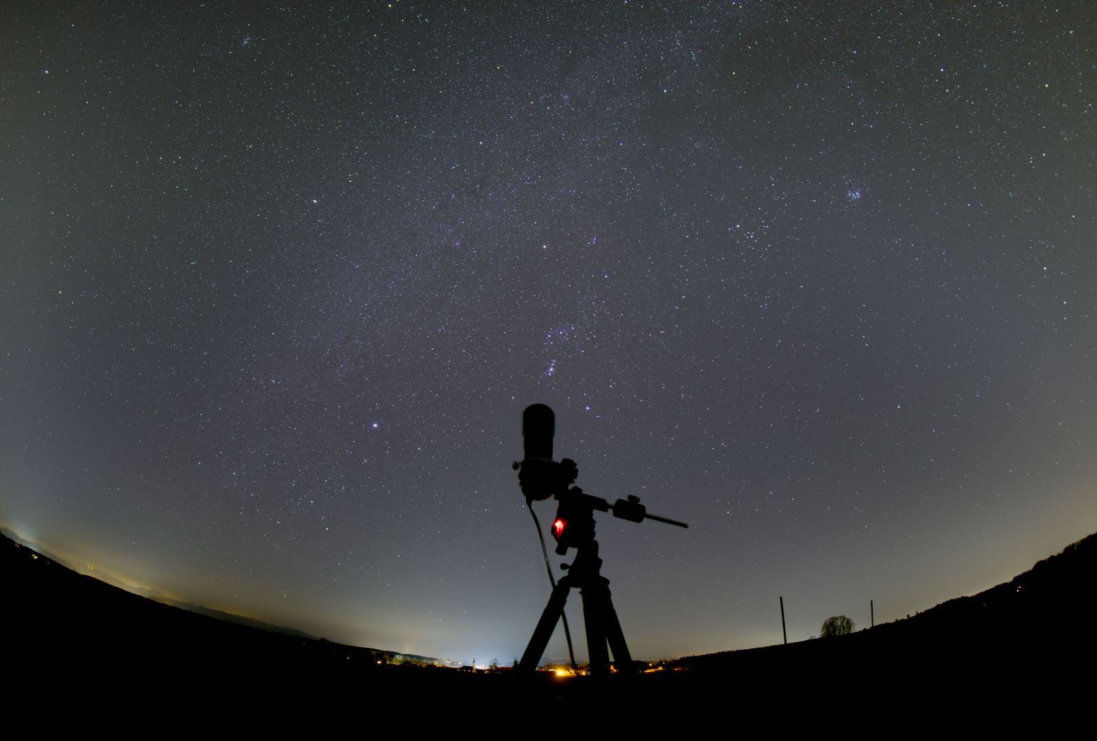 Bayerisches Oberland, südlich von München, Bortle 4, Winter- Milchstraße leicht strukturiert sichtbar. Making Of mit Olympus 8 mm f/1,8 Fish Eye und der Canon als "Model" |