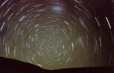 Southern pole with Magellanic Clouds. Bolivia 1994 35 mm 1:2.8. Ca. 40 minutes exposure on Fujichrome 1600 |