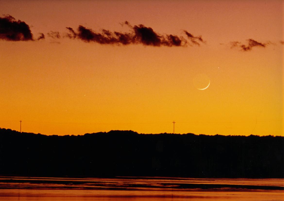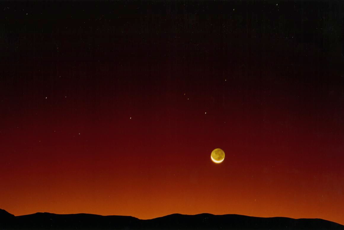 Moon in Scorpius at dusk 1 day and 11 hours after solar eclipse. Bolivia 04.Nov.1994, 23:35 UT 80mm 1:1.8. Approx. 15 seconds on Ekrarchrome 100 |