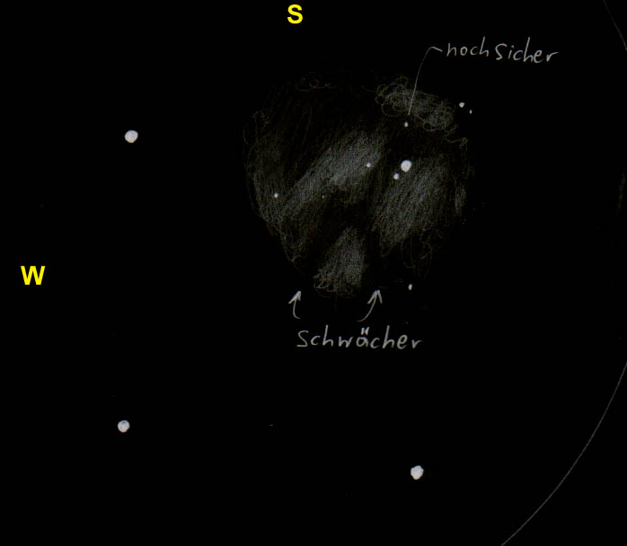 43 = PK 36+17.1 Ophiuchus (Galaktischer Fußball) U2000: 204 / 86R 24" f/4,1 Dobson fst: 6m0, Bortle: 4, Seeing: 4, 900 m hoch, nass. 11. Jun. 2001 Im 32 mm Wide Field (80x) an der Stelle 3 Sterne eng zusammen im rechtwinkeligem kleinem Dreieck. Darum sehr diffuses zartes Glühen. Im 15 Panoptic (170x) löst sich Stern Dreieck schon besser vom Restglow, das aber immer noch sehr zart bleibt. Mit OIII- Filter wird daraus sofort ein sehr heller Planetary! Ca. 1’-1,5’ groß, insgesamt rund, außen scheinbar etwas heller als im Zentrum. Im 9 mm Nagler (280x) + OIII irgendwelche Strukturen, die aber sehr schwer zu fixieren sind. Ein Dunkelkeil von Osten reinragend, noch ein weiterer von Süden? Sehr unsicher. Erinnert zeitweise an den Trifid N. Sehr Schön! |