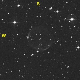 Abell 34 = PK 248+29.1 Hya U2000: 278 / 133L 24" f/4,1 Dobson Im 24 mm Wide Field + OIII direkt südlich des 3-er Bogens großer schwacher Planetary als homogene Fläche mit teilweise helleren Rändern. Südlich + westlich, hellerer Bogen, sowie NO hellerer Knoten. Die Galaxie PGC 3081651 (0,6'x0,3') am W- Rand war im 9 mm Nagler (280x) ohne Mühe als 2:1 elongierter recht gut durchgezeichneter Blob sichtbar. |