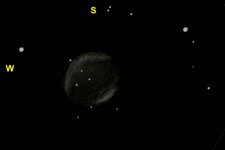 Abell 31 Zeichnung am 24" mit 24 mm Wide Field (105x) + OIII- Filter. Sterne ohne Filter Anm: Die Außenpartien habe ich gar nicht gesehen, der ist auf dem DSS Bild noch größer! |