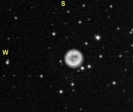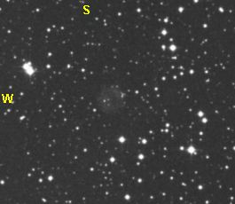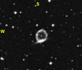 PK 102-2.1 Lacerta U2000: 57 / 19L 24" f/4,1 Dobson fst: 6m0, Bortle: 3-4, Seeing: 2-, 900 m hoch. 22. Aug. 2001 Im 15 mm Panoptic (170x) an der Stelle etwas zu erahnen, aber unsicher, da dort auch einige Sterne sind. Mit OIII popt Planetary sofort zwischen den Sternen heraus. Im 9 mm Nagler (280x) + OIII rund oder leicht oval in O-W. Insgesamt zart, zur Mitte ganz leicht schwächer. Nach außen recht diffus auslaufend. Ein Stern 14 mag nahe Zentrum (ist aber nicht der Zentralstern). Weitere Sterne im Osten. |