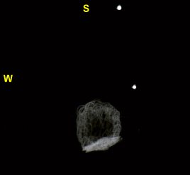 83 = PK 113-6.1 Cassiopeia U2000: 35 / 18R 24" f/4,1 Dobson fst: 6m6, Bortle: 2-3, sehr transparent, Seeing: 3-4, 2000 m hoch. 17. Sep. 2004 Feld mit DSSII- Ausdruck gefunden. Mit 13 mm Nagler (194x) + OIII-Filter ab und aufblitzend. Im 9 mm Nagler (280x) + OIII etwas leichter zwischen einem Doppelstern WSW-lich und einem Parallelogramm NNO-lich zu sehen. Zartes, sehr zartes Glühen, nur indirekt und schwer, aber immer wieder sicher gesehen. Nach außen recht diffus auslaufend. Keine weiteren Details. kleiner als 1'. Frank und Volker sehen ihn auch. |
