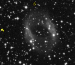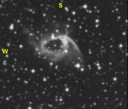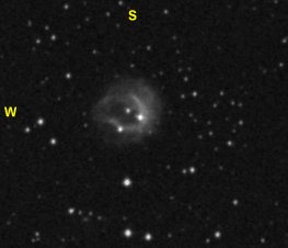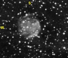 PK 114-4.1 Cassiopeia U2000: 35 / 2R 24" f/4,1 Dobson fst: 6m2, Bortle: 3-, Seeing: 3, 1300 m hoch. 15. Aug. 2001: Im 32 mm Wide Field (80x) an der Stelle ein Sternknäuel mit scheinbar etwas Gas umgeben (nicht sicher mit dem Gas). Im 15 mm Panoptic (170x) + OIII erscheint sofort ein schöner großer Planetary. Ein Stern ca. 14 mag etwas SO außerhalb der Mitte. (Anm. das ist nicht der Zentralstern, den hatte ich mit Filter nicht bemerkt). An der Stelle hört Planetary fast auf, während er nach NW weiter ausladend erscheint. Insgesamt leicht diffus nach außen auslaufend. |