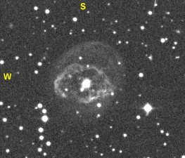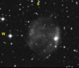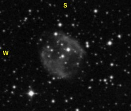 72 = PK 59-18.1 Delphin U2000: 209 / 84L 17,5" f/4,5 Dobson Im 15 mm Panoptic (170x) + OIII- Filter: Ein riesig großer Nebel, deutlich im indirekten Sehen mit inneren Strukturen. Im 9 mm Nagler (280x) + OIII Strukturen als unregelmäßige Ausleuchtung der Scheibe (fleckiges Aussehen). Herrliche Gesamtansicht, einfach ein schöner Planetary. Ohne Filter direkt 1’ südlich die MCG +2-53-5 (ca. 16 mag) entsprechend DSS Ausdruck versucht: Nichts! Im 30" f/5 von Rafael sind die Strukturen deutlicher durchgezeichnet. |