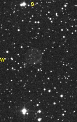 PK 112-10.1 Cassiopeia U2000: 35 / 18R 24" f/4,1 Dobson fst: 6m2, Bortle: 3-, Seeing: 3, 1300 m hoch. 15. Aug. 2001: Im 32 mm Wide Field (80x) an der Stelle verdächtige Kondensation. Im 15 mm Panoptic (170x) + OIII ein schöner großer Planetary. Leicht elongiert in O-W Richtung, wobei die Ostflanke scheinbar weiter ausgedehnt ist. Mittenbereich etwas heller, auf halben Wege Abfall. Wie ein Dotter im Spiegelei. Manchmal Unregelmäßigkeiten, Position jedoch nicht fixierbar. Vielleicht ein Keil von Norden. Ein Stern 12 mag nahe O- Rand. (Anm. habe offensichtlich nur die zentrale Hantel gesehen). |