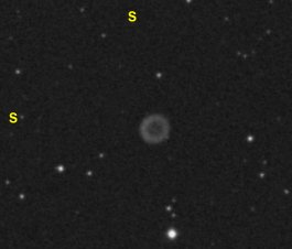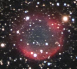 Abell 61 = PK 77+14.1 Cygnus U2000: 83 / 33L 24" f/4,1 Dobson fst: 6m6, Bortle: 2-3, sehr transparent, Seeing: 3-4, 2000 m hoch. 17. Sep. 2004 Sofort im 24 mm WF (105x) + OIII zu sehen! Im 15 mm Panoptic (168x) + OIII zunächst genau runde homogene Scheibe, indirekt leicht zu halten. Beim weiter indirekt gucken blitzt Ring auf mit der W-Seite feiner und heller als der Rest. Ein paar Sterne scheinen durch. Auch mit UHC leicht zu halten, hier diffuser auslaufend. |