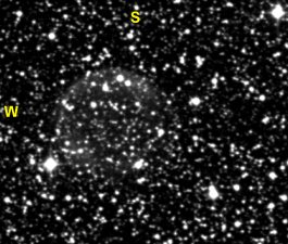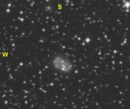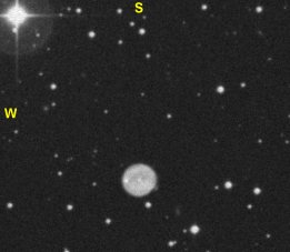 68 = PK 43-13.1 Vulpecula U2000: 252 / 104R 24" f/4,1 Dobson fst: 6m6, Bortle: 2-3, sehr transparent, Seeing: 3-4, 2000 m hoch. 17. Sep. 2004 In prominenter Nachbarschaft direkt 1° südlich vom Hantel Nebel. Im 13 mm Nagler (194x) + O-III Filter sofort im rechten Winkel zu einem Sternpaar ca. 13m zu sehen. Weniger als 1' groß, homogene Scheibe, die zum Rand erst leicht, dann schneller schwächer wird und gut definiert aufhört. Sicher indirekt zu halten. Auch ohne Filter sichtbar, aber sehr schwer und diffuser auslaufend, dafür aber mit Zentralstern ca. 15m5, der etwas NO vom Zentrum versetzt scheint (die 13m2 laut DSFG können kaum stimmen, der ZS ist schwächer). Weitere 3 ähnlich schwache Sterne in direkter Nachbarschaft. Einfacher als ich dachte. |