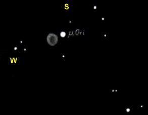 Direkt 50" westl. von m Ori reitend. Im 15 mm Panoptic (170x) + OIII sofort hell zu sehen, trotz des gleißend hellen Sterns. Ohne Filter überstrahlt Stern. Im 7 mm Nagler (360x) + OIII ca. 30" große helle Scheibe mit Loch in der Mitte. Manchmal Dunkelstrukturen? (unsicher). Nach außen sehr scharf definiert aufhörend. Mit 32 mm Wide Field (82x) + UHC, 24 mm Wide Field + OIII und 15 mm