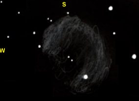 Im 15 mm Panoptic (170x) + OIII sichelförmige Gesamtform, nach NW offen, erinnert an einen Embryo. Am SW Rand eine helle Kondensation 3:1 elongiert. Das ist der hellste Teil des Nebels, er wird vom Restteil durch ein Dunkelgebiet abgetrennt. Am NO-Rand um Sternchen eine weitere rund-ovale Kondensation. Um hellen Stern nach S wieder schwächer mit Fasern. Am N- Ende sehr diffus in ganz schwaches Gegase auslaufend. Weitere zart angedeutete gemottelte und gefaserte Strukturen überall im Nebel (unmöglich, das alles zu zeichnen).