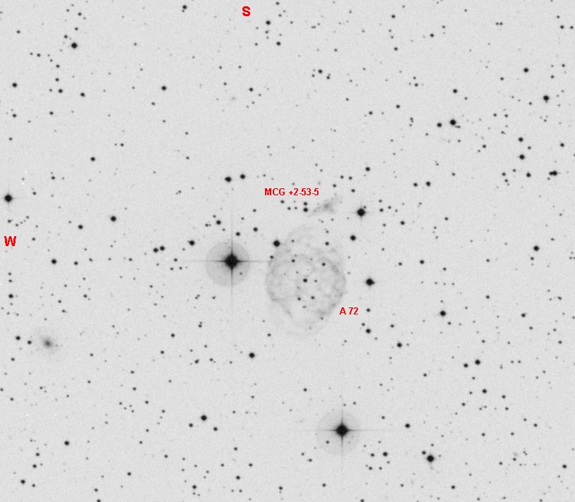 ![]() DSSII Bild von Abell 72 im Delphin. Süden ist oben. Klick auf's Bild für eine größere Übersicht |