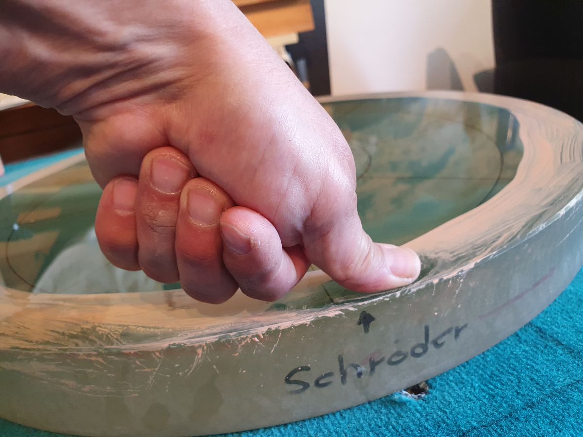 When polishing telescope mirrors amateur mirror makers frequently face the phenomenon "tuned down edge" or more correct "lagging edge". This means, that the edge area has a too long radius of curvature (ROC) compared to the rest of the surface. Usually this happens, when the inner part of the mirror is polished stronger than the very outer part, so the middle is deepened more and more, while the edge area is left behind with a too long ROC. How this can be avoided see my Tipps und Tricks (German text) at polieren, zurückgebliebener Randbereich. Once the error has occudred, it seems to make trouble, to correct it and some feel forced, to go back to fine grit stage. Therefore I want to show on an example of a 20 inch mirror, how an even strongly pronounced long focusing edge area on a mirror of this size can be corrected efficiently. For smaller mirrors alternatively a full size ring tool can be used.