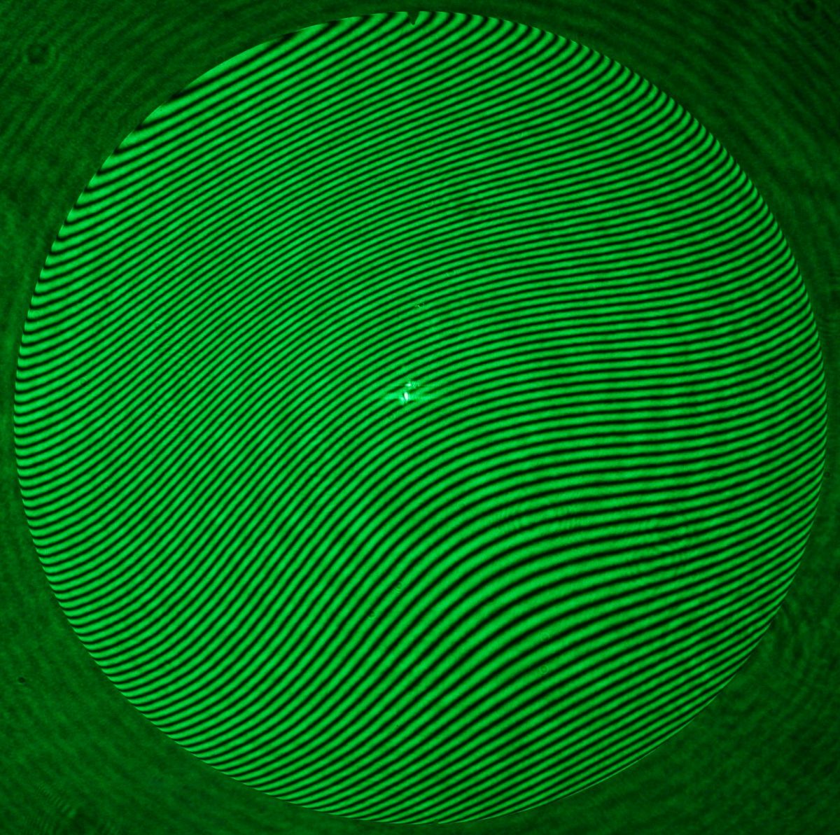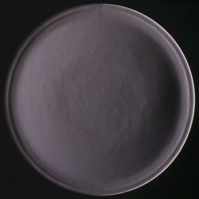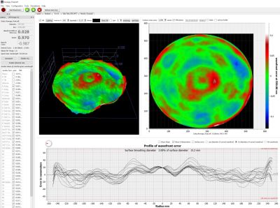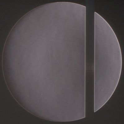 The problematic 505 mm f/5 mirror at Foucault test at the center of curvature with the knife edge coming from the left. It shows a fairly spherical surface, but the outer ~ 25 mm have a far too long ROC. The interferometer measurement reveals a low edge of more than 1 micron (~ 2 waves): This is so severe, that it would take excessively long time, to get the whole area down to the edge level. It is much more effective, to selectively polish the area just inside the edge and get a new average ROC, which is between that of the middle and that of the edge. |