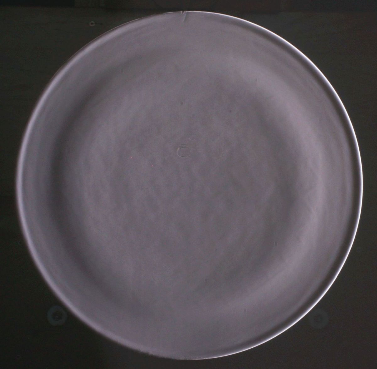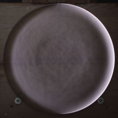 This produces a new wider zone, which is much shallower than that before. It this case here I even overcompensated it, which is not harmful at all - it even helps in the further course, to keep the edge from getting too low again. At this stage the mirror can be smoothed out with a large 40 cm polishing tool working Tool on Top (TOT). It is essential, that the pitch lap makes good contact all over (channels in the middle not narrower as at the edge) and that you find the "neutral stoke" which polishes the edge no less than the middle, to avoid leaving the edge behind again (see video of polishing a 60 cm meniscus mirror with a 40 cm Tool (18MB). |