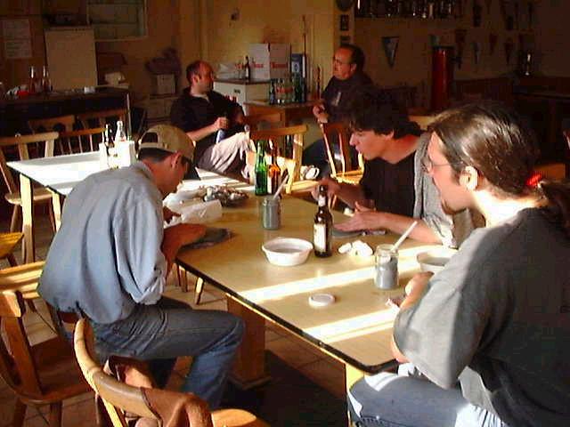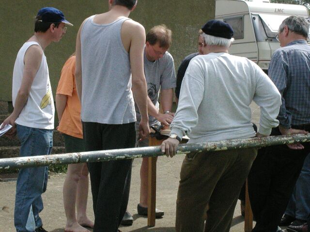 ![]() Umziehen nach drinnen um Sonnenbrand und Kontamination mit groben Körnern zu vermeiden. Am Nachmittag sind alle mit #800 Karbo fertig, bis auf mich, ich musste so viel quatschen. Polieren geht zu Hause weiter. |
