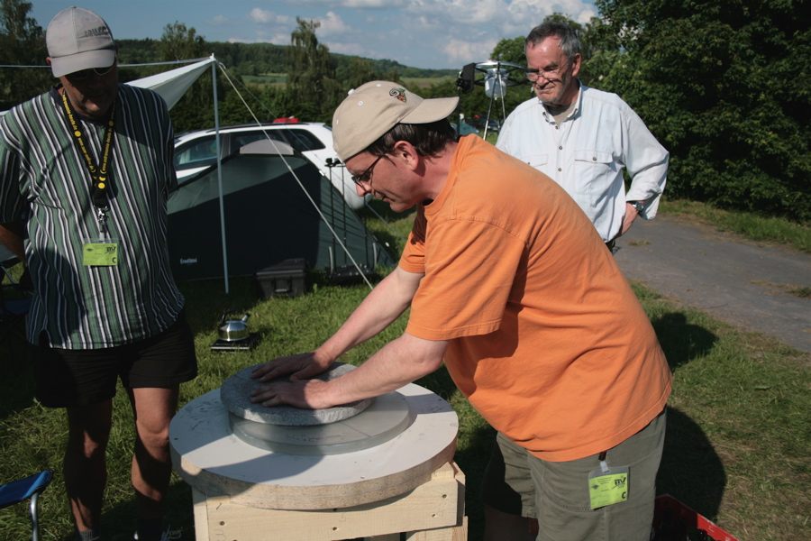 ![]() Wolfgang kam gut vorbereitet mit Werkbank, Eimer und Lappen..., machte die Fase mit dem Schleifstein... (Bild von Christian) |