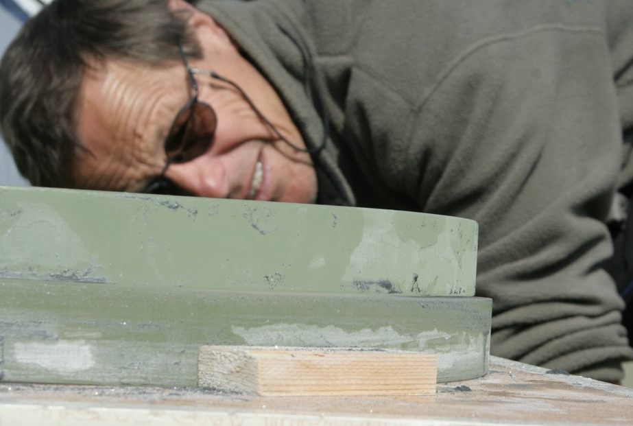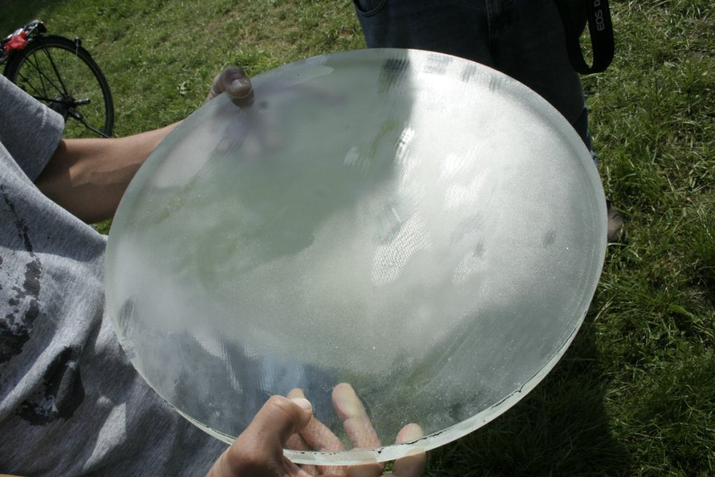 ![]() Stathis zeigte das Planschleifen der Rückseiten an einem 40 cm gegen einen 46 cm Rohling von der neuen Sorte Borosilikatglas mit 28 mm Dicke (Bild von Christian) |