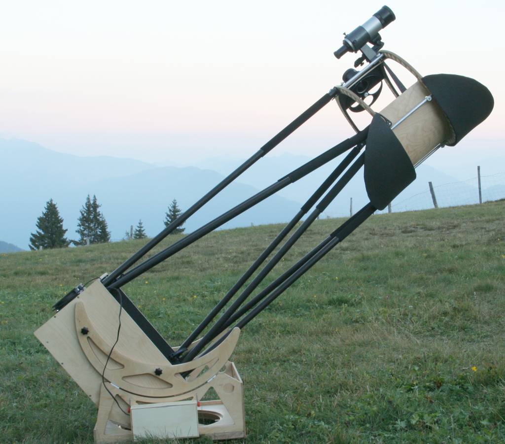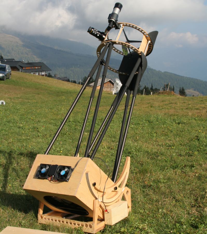 Gerade zu dieser Zeit aber begannen die Taiwan-Dobsons so richtig billig zu werden und so wurde der Plan gefaßt, einen GSO 1080 (Ausstellungsstück, ziemlich günstig) zu kaufen, das Blechrohr wegzuwerfen und mit den anderen Teilen einen schönen Gitterrohrdobson zu bauen.