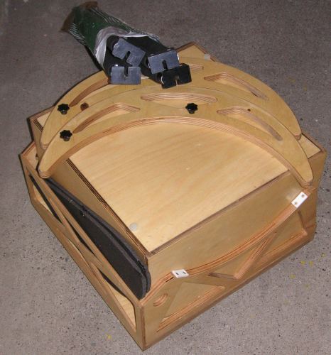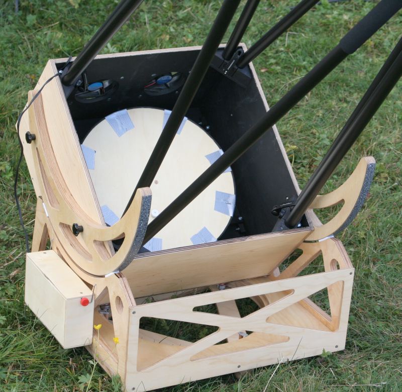 Die Rockerbox wurde von unserem Reisedobson hochskaliert, aber diesmal ohne Mittelschraube. Der Boden in Sandwichbauweise hat einen runden Ausschnitt, die Rockerbox dreht sich um drei Kugellager im Bodendreieck. Das Bodendreieck war ursprüglich aus 6mm Multiplex, mußte aber nach einer Beschädigung mit Flugzeugsperrholz umleimt werden. Der Boden der Rockerbox erwies sich als nicht steif genug gegen Torsion, ein eingeleimtes 6mm-Brett half und dient jetzt auch als Auflage für die Spiegelbox beim Transport. |