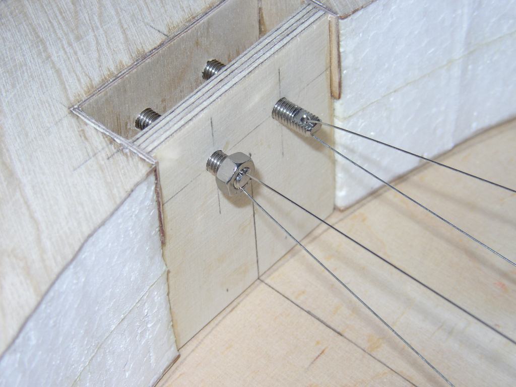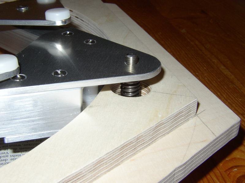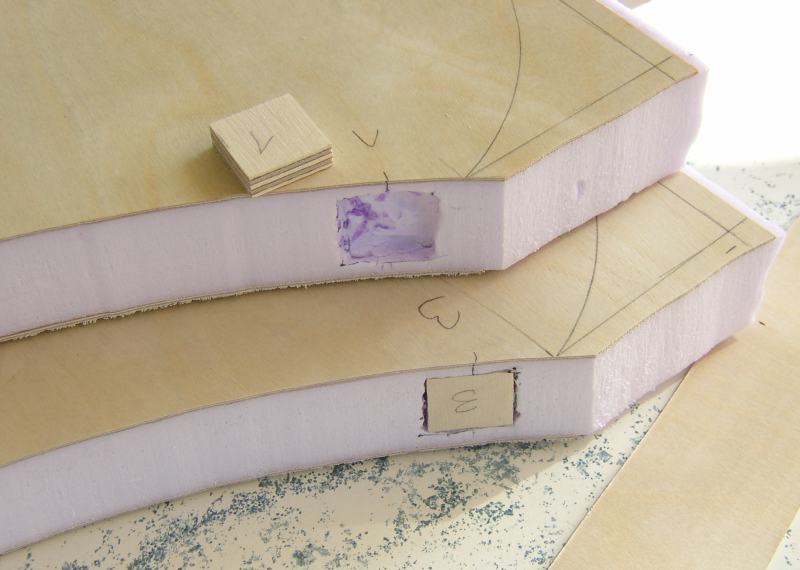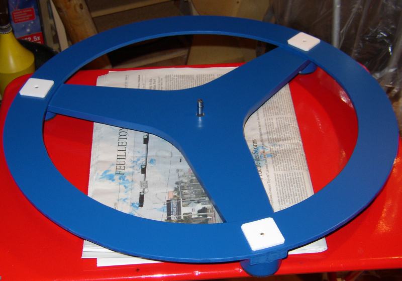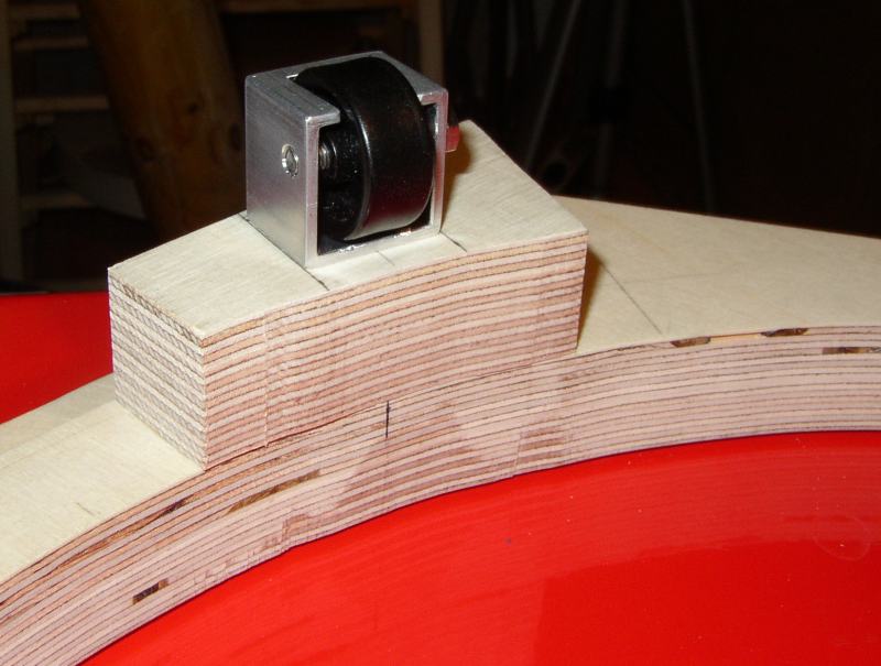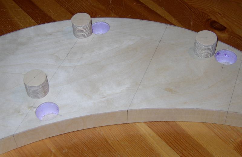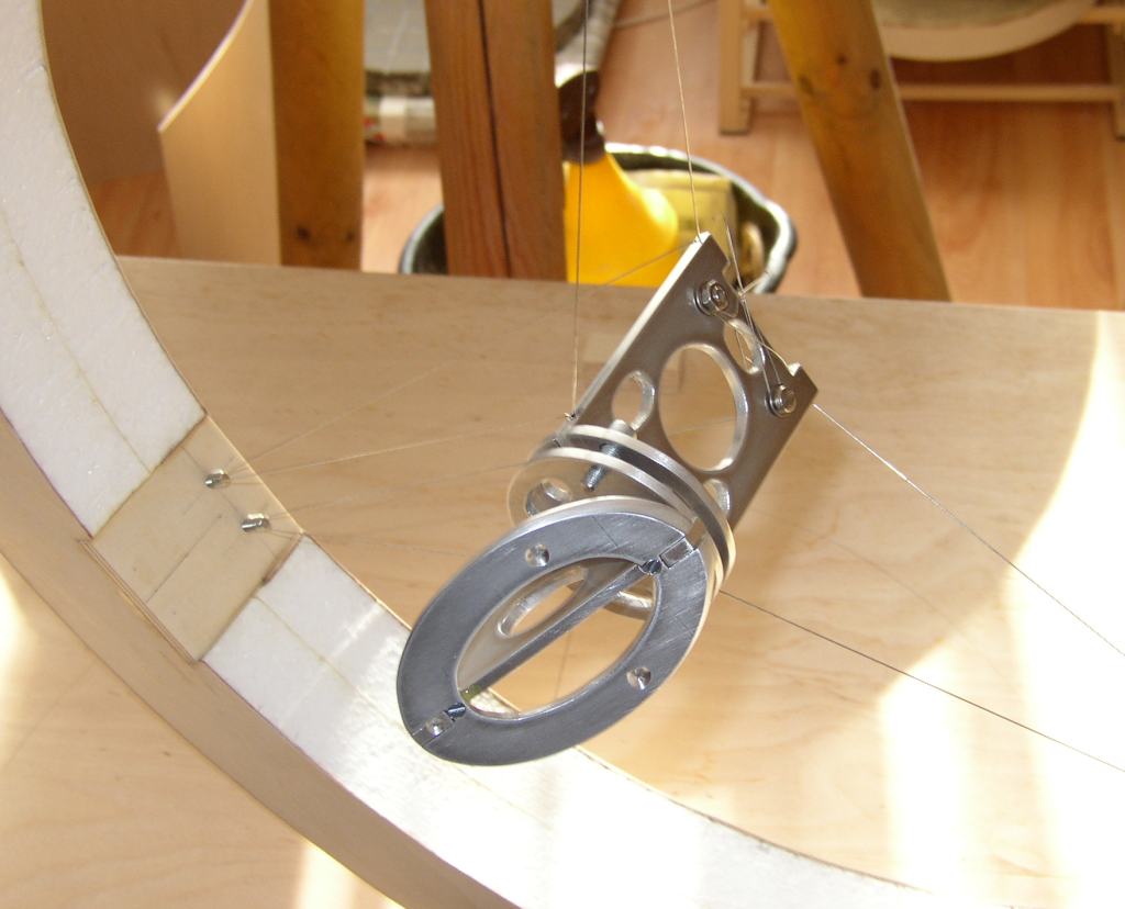 Auch die Teile der Rockerbox sind in der gleichen Weise hergestellt: 30 mm Hartschaumkern, alle Außenflächen beplankt mit 1 mm Flugzeugsperrholz. Zum Befestigen der Teflon-Gleitflächen sind im Hartschaumkern Verankerungen aus 6 mm Multiplexsperrholz eingelassen. Auf die Unterseite der Rockerbox ist ein Ring aus 6 mm Multiplexsperrholz aufgeleimt, über den die Auflagekräfte der Azimutlagerung gleichmäßig verteilt werden.